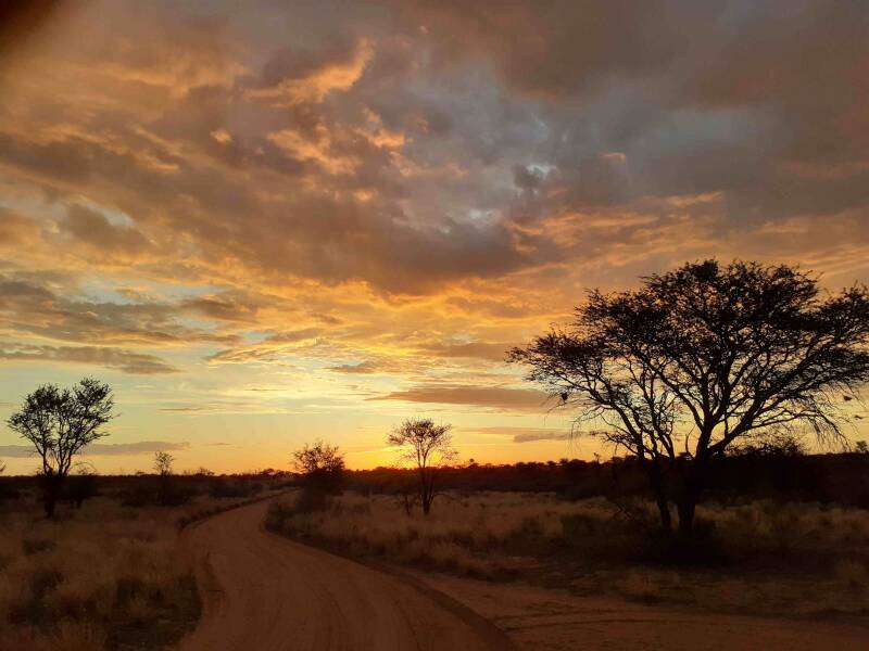 Heute war die Thermik überwiegend blau. Das heißt, dass der Ort der Aufwinde nicht durch Cumuluswolken (oft auch als "Schönwetterwolken" bezeichnet) gekennzeichnet war. Hayung war heute Pilot in Command (PIC) und ich die Crew. Es war recht schwierig, die Aufwinde zu finden und die Steigwerte des Flugzeugs durch geschicktes Steuern zu optimieren. Ich selbst konnte als Crew eine Zeitlang das Steuern des für mich neuen Flugzeugmusters "Nimbus 3DM" üben. Insgesamt konnten wir ca 340 Streckenflugkilometer zurücklegen und dabei Flughöhen von bis zu 4300m über Meeresspiegel erreichen. In dieser Höhe benötigt man bereits Sauerstoffzusatz beim Atmen, um mögliche Symptome der Höhenkrankheit sicher zu vermeiden. Besonders beeindruckt mich in Namibia die Aussicht über die Kalahari-Wüste, die ganz anders als ein Blick über Norddeutschland ist: Heute waren es die Dornbuschsteppe mit ausgetrockneten Flussläufen, mittleres Bergland und Sand- und Tonpfannen, die die Landschaft kennzeichneten. Und Abends ein toller Sonnenuntergang am Eingang der Farm ...