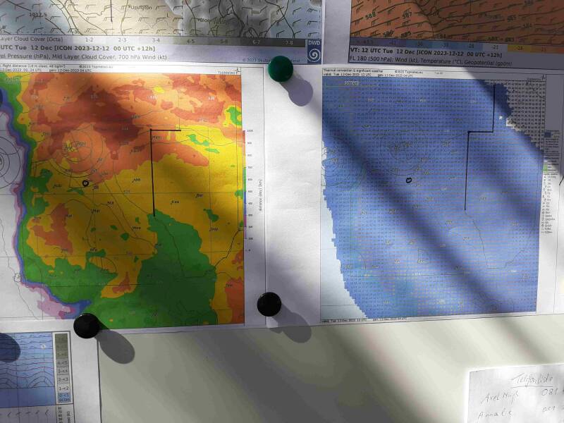 Die Wettervorhersage am Dienstag Morgen war klar: Östlich und südlich von Windhoek keine Wolken zu erwarten, also Blauthermik. Die sollte aber sehr gut werden, was man an der gelben und braunen Einfärbung der Segelflugwettervorhersage links im Bild als Maß für die erreichbaren Strecken für die Gebiete um Pokweni sehen kann. Ab 12 Uhr soll die Thermik beginnen. Also machen Rolf und Hayung ihren Doppelsitzer fertig und sitzen tatsächlich kurz nach 12 Uhr startklar im Nimbus. Der einfahrbarer Hilfsmotor bringt uns dann schnell auf 900m über Pokweni.