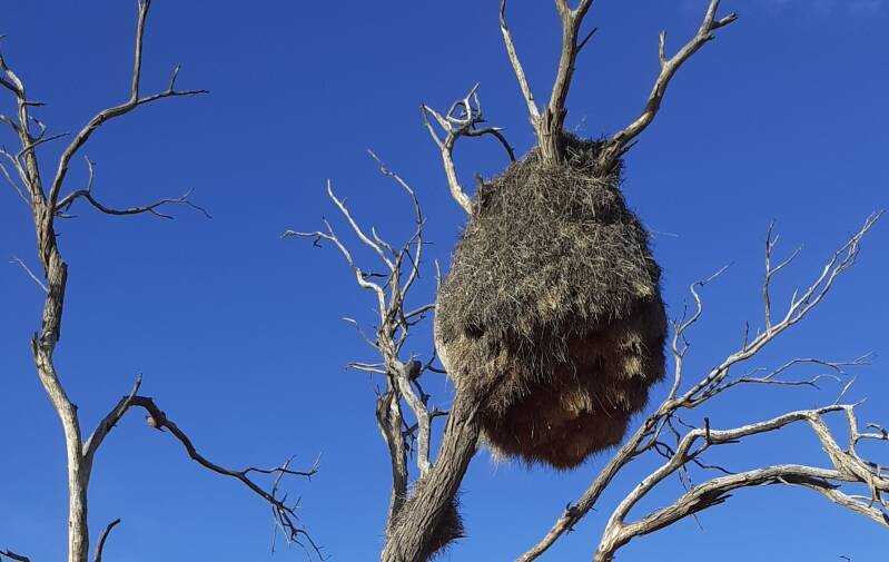 Heute am Freitag bestand die meteorologische Aussicht in mäßiger Blauthermik. Das Nimbus 3 - Team entschloss sich daraufhin, nach 10 Flugtagen einen Tag Pause einzulegen. Der heutige Beitrag beginnt daher mit Bildern meines morgendlichen Spaziergangs um die Farm und endet beim Abendessen. Als Blickfang für heute dient der Burgenbau der Webervögel an einem abgestorbenen Baum auf einer nahen Düne.