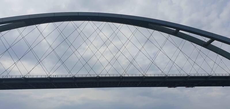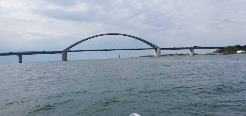 Nachmittags gegen 16 Uhr kommen wir im Fehmarnsund an, hier ist die Brücke die weithin sichtbare Landmarke. Wir sind froh, so früh anzukommen, denn die ersten Gewitter sind bereits nördlich von Heiligenhafen zu sehen. Und tatsächlich, abends im Restaurant haben wir 2 Stunden Gewitter mit Blitz, Donner und starkem Regen. Die Anstrengungen der langen Segeletappen sind schon fast vergessen. Unser letztes Bild zeigt alle 6 Gastlandflaggen, die wir auf unserer Reise in den Häfen verwendet haben. Fun With Flags (Flagtacular, nach Sheldon Cooper).