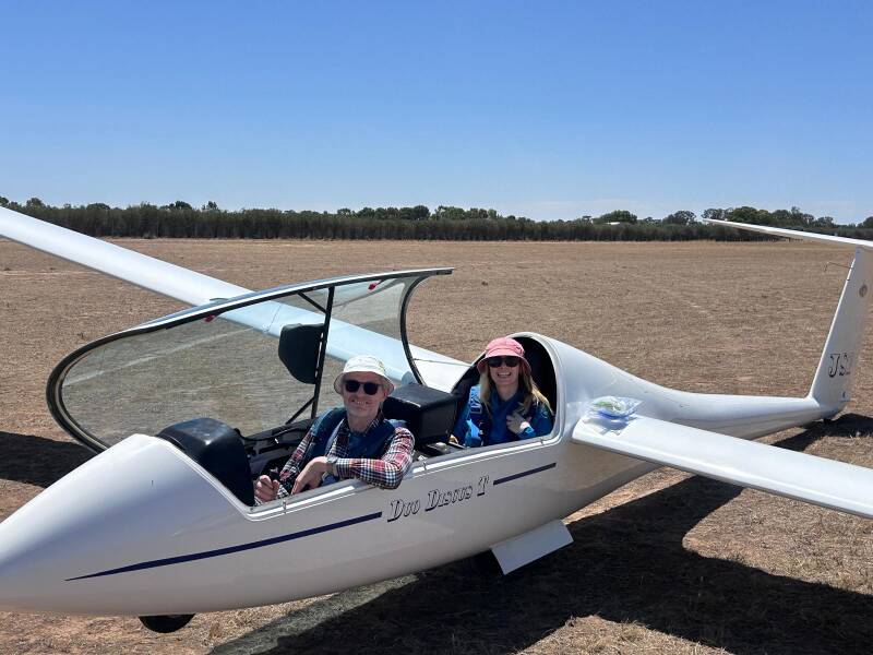 Kurz nach 13 Uhr Ortszeit starten wir, Lisa und ich. Wir freuen uns darüber, dass die Thermik gleich beginnt. Auf halbem Wege zum Rock kommen wir in der Blauthermik mit 650m etwas tief. Das ist auch im Tagesschrieb unseres Fluges zu sehen. Beinah hätten wir unseren Hilfsmotor ziehen müssen. Erst nach 120 km erreichen wir die Cumulus-Wolken. Das bedeutet, dass wir die Wolken mit Aufwinden bis 2500m Höhe nur für ungefähr eine halbe Stunde genießen können, danach wieder ab ins Blaue, in Richtung Tocumwal. Am Ende erhalte ich für diesen vorab deklarierten Rückkehrflug auch noch einen sogenannten Explorer-Badge, so dass ich auf der lustigen Level-Liste des großen Segelflugspiels der Weglide Plattform auf der Stufe "Level5" ankomme. Was für ein Erfolg.